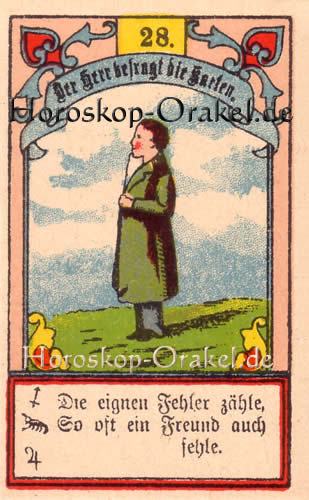 Seien Sie nicht zu egoistisch: Wenn Sie ein Mann sind, dann wird dieser Tag ein egoistischer Tag für Sie werden. Sie werden versuchen, Ihre Meinung und Ihren Willen durchzusetzen, koste es, was es wolle. Mal eine egoistische Phase zu haben ist ok, denn die hat jeder von uns ab und zu. Doch passen Sie auf, dass sie nicht lange anhält und dass Sie sich dabei keine Feinde schaffen. Wenn Sie eine Frau sind, dann werden Sie sich am heutigen Tag hauptsächlich um Ihren Mann kümmern. Verwöhnen Sie ihn doch mal wieder! Der Orakelspruch der Karte der Herr: Die eigenen Fehler zähle, so oft ein Freund auch fehle. Seien sie nie überheblich, sondern bleiben Sie mit den Füssen auf dem Boden der Tatsachen: Sie sind nicht unfehlbar. ![]() Die allgemeine Bedeutung der Karte der Herr: Diese Karte ist als Einzelkarte kaum eine Bedeutung. Die Lage dieser Karte läßt Rückschlüsse ziehen, wie die männliche Hauptperson derzeit mit dem Leben zurecht kommt. Ganz oben hat er alles im Griff, ganz unter überollt ihn alles. Liegt er am Rand einer Auslage und schaut aus dem Blatt heraus, so hat er eine sehr erlebnisreiche Zeit hinter sich, die erstmal verdaut werden muß. Schaut er in das Blatt hinein, hat er mit der Vergangenheit abgeschlossen und schaut in das Neue hinein. Diese hier verwendeten astrologischen Wahrsagekarten wurden Ende des 19. Jahrhunderts in Neuruppin erstellt. ![]() ![]() Wie gefallen Ihnen die Lenormandkarten von Gustav Kühn?